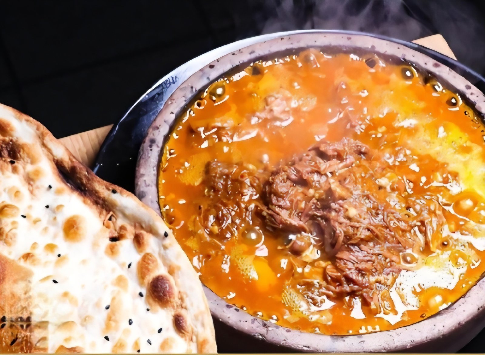 لحم بقري مطهو حتى الذوبان في صلصة الطماطم والثوم، يُقدم بالطريقة التقليدية في حرضة (وعاء حجري) مع الحلبة