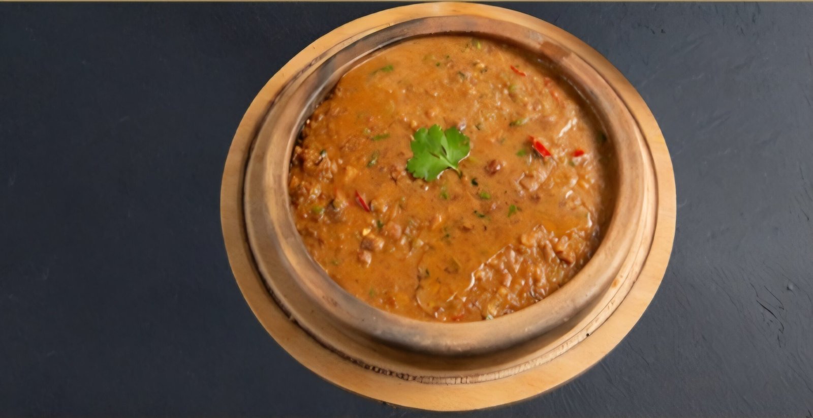 سلتة غنية مع لحم غنم مفروم، خضار وأرز، تُقدم في حرضة مع الحلبة.