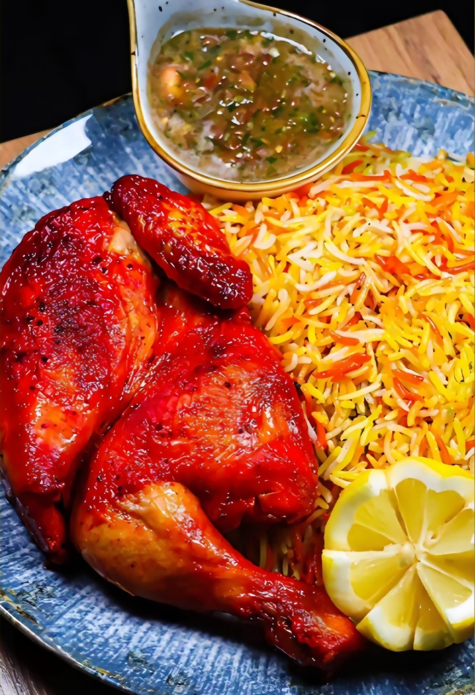 مطهو ببطء مع بهارات المندي والزعفران، يُقدم على أرز المندي.