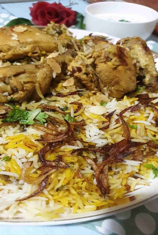 مطهو ببطء مع بهارات المندي والزعفران، يُقدم على أرز المندي.