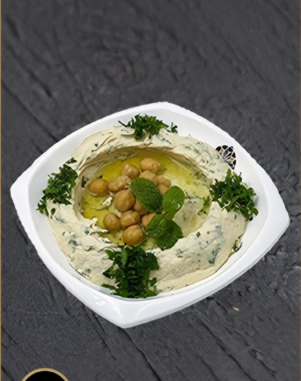 حمص كريمي مزين بالبقدونس المفروم وزيت الزيتون