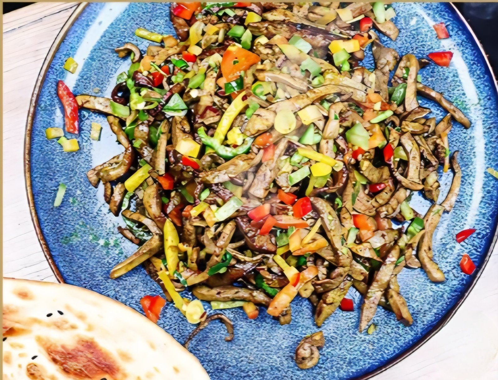 كبدة غنم طرية ومقلية بقوة مع البصل، الفلفل الحلو، الفلفل الحار، الثوم، الكزبرة والكشنة