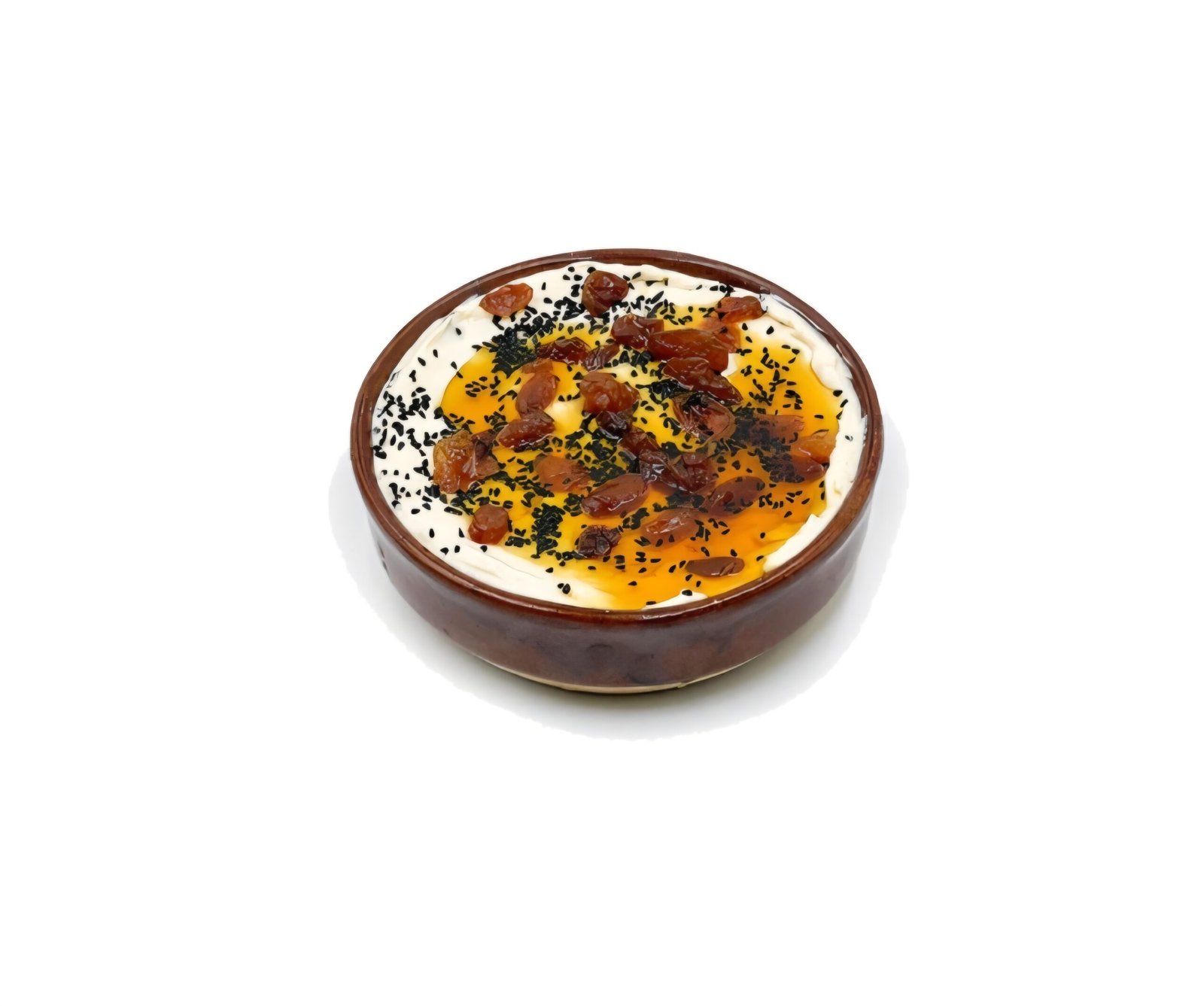 خبز مفتت ممزوج بالزبدة المذابة والتمر المفروم، مغطى بالقشطة، الجبن، الحبة السوداء وخيط من العسل