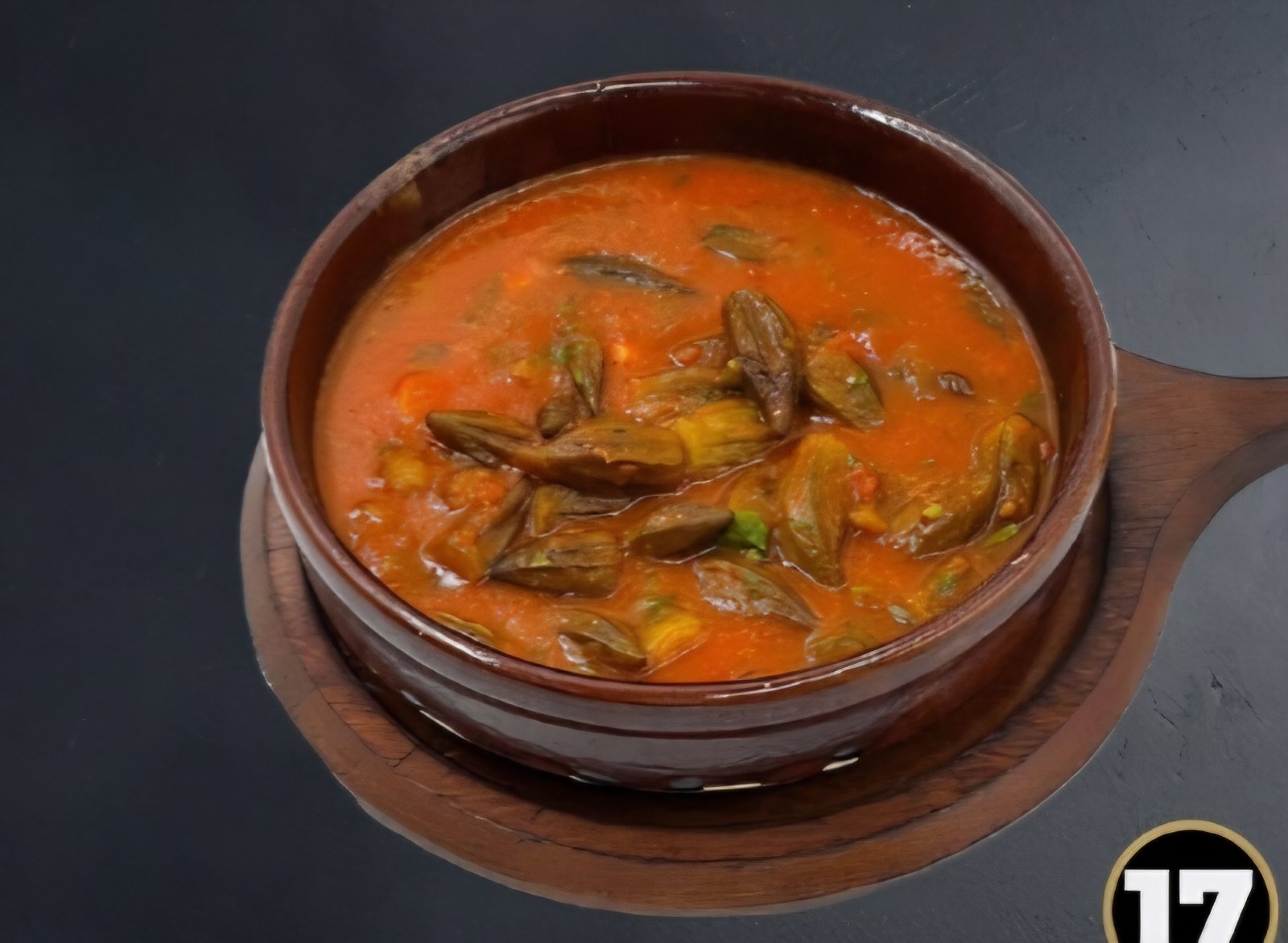 بامية طرية في صلصة الطماطم والخضار، تُقدم في وعاء فخاري.