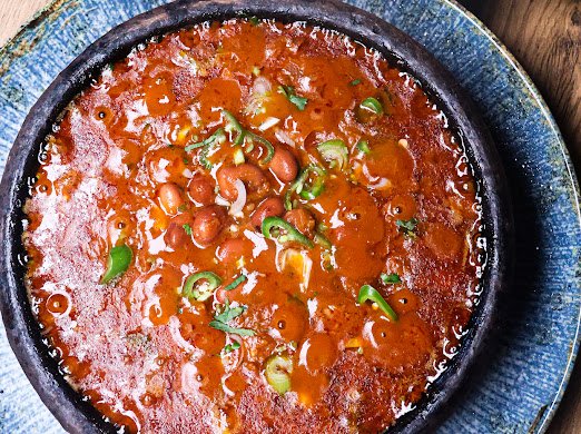 بامية مطبوخة مع 400 جرام من لحم الغنم الطري، تُقدم في وعاء فخاري.