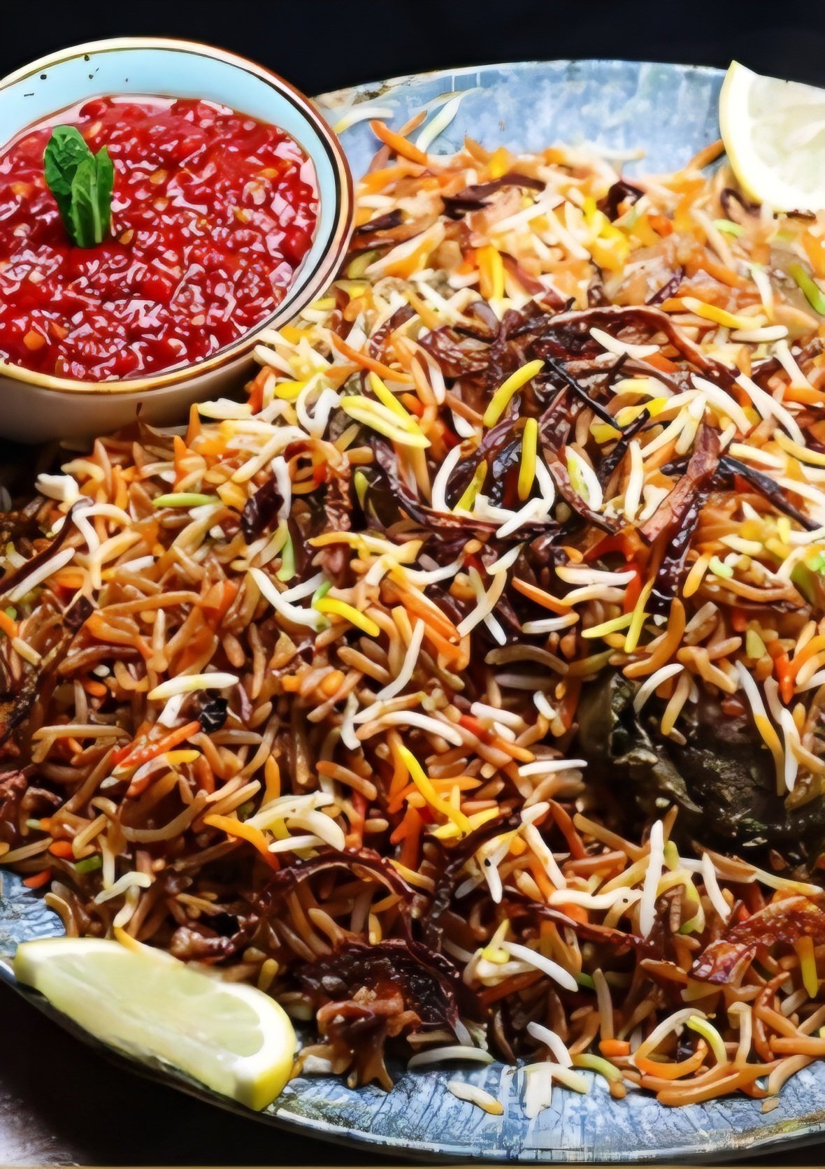 معدّ في طبقات ومطهو ببطء مع الزبادي، البصل المحمر، والثوم، مع مزيج متميز من الهيل، الكمون، القرفة، والقرنفل. طبق غني بالنكهات العطرية ويتميز بمذاق استثنائي خاص.