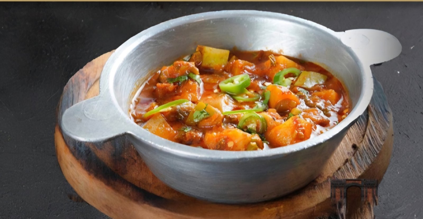 بامية طرية في صلصة الطماطم والخضار، تُقدم في وعاء فخاري.