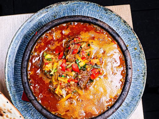 بامية مطبوخة مع 400 جرام من لحم الغنم الطري، تُقدم في وعاء فخاري.